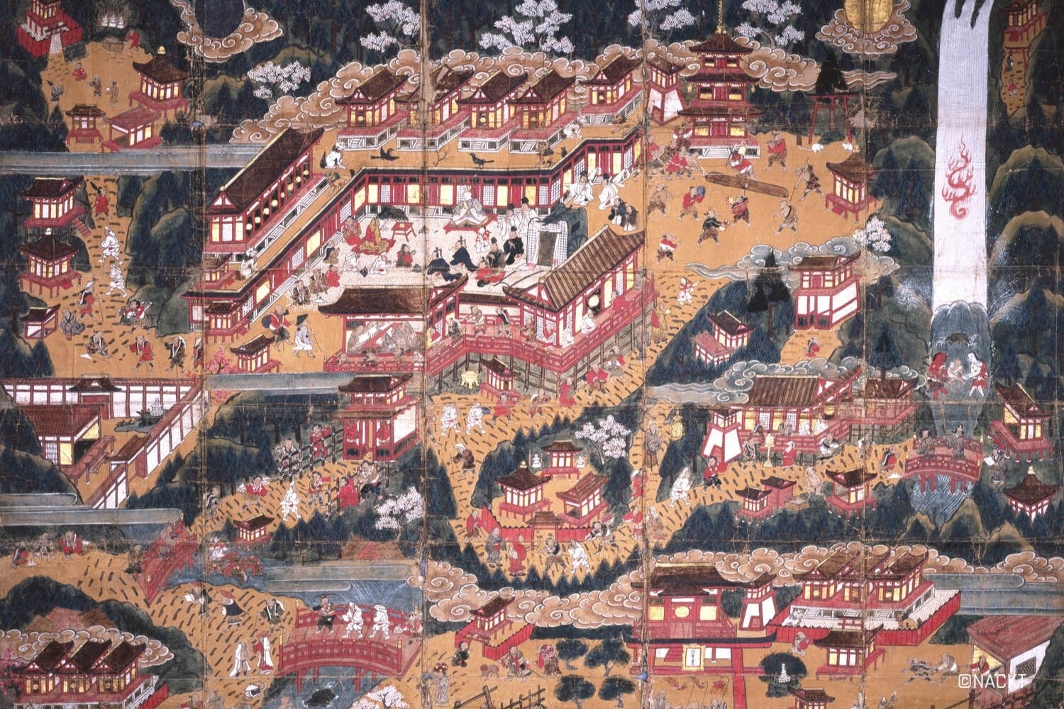 那智参詣曼荼羅図には、那智山の賑やかさの一方、補陀洛渡海や応照上人、妙法山、花山法皇の33観音巡礼などの物語が描かれており、全国で「絵解き」をしながら熊野をPRしていました