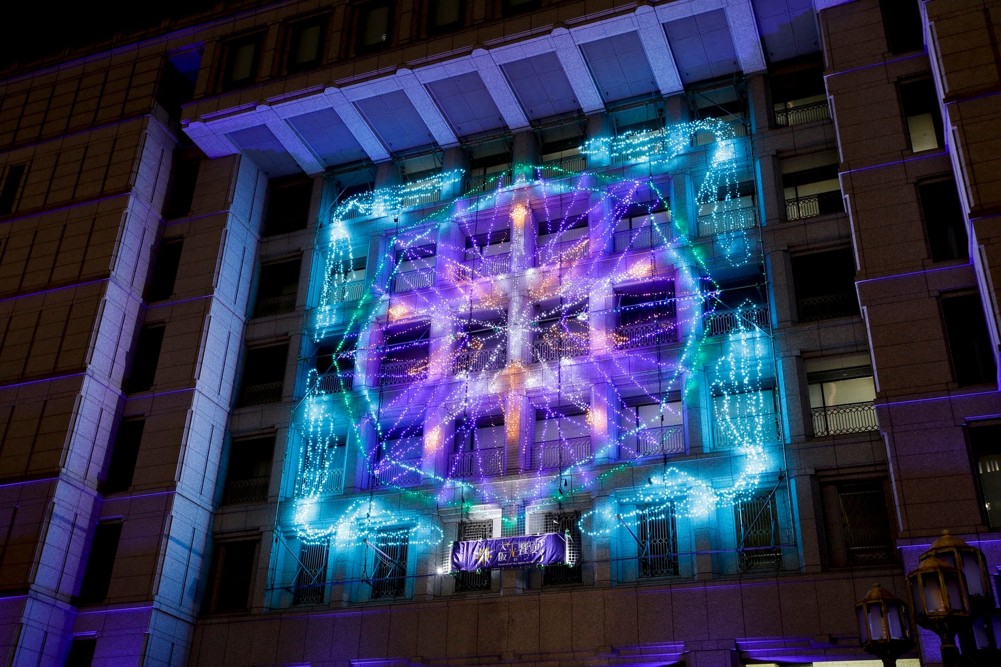 光の線が表すのは「人と人のつながり」。大阪市役所正面を照らすイルミネーションが、OSAKA光のルネサンスの玄関口を彩ります。今年は3DマッピングLEDを導入し、新たな輝きを放ちます。