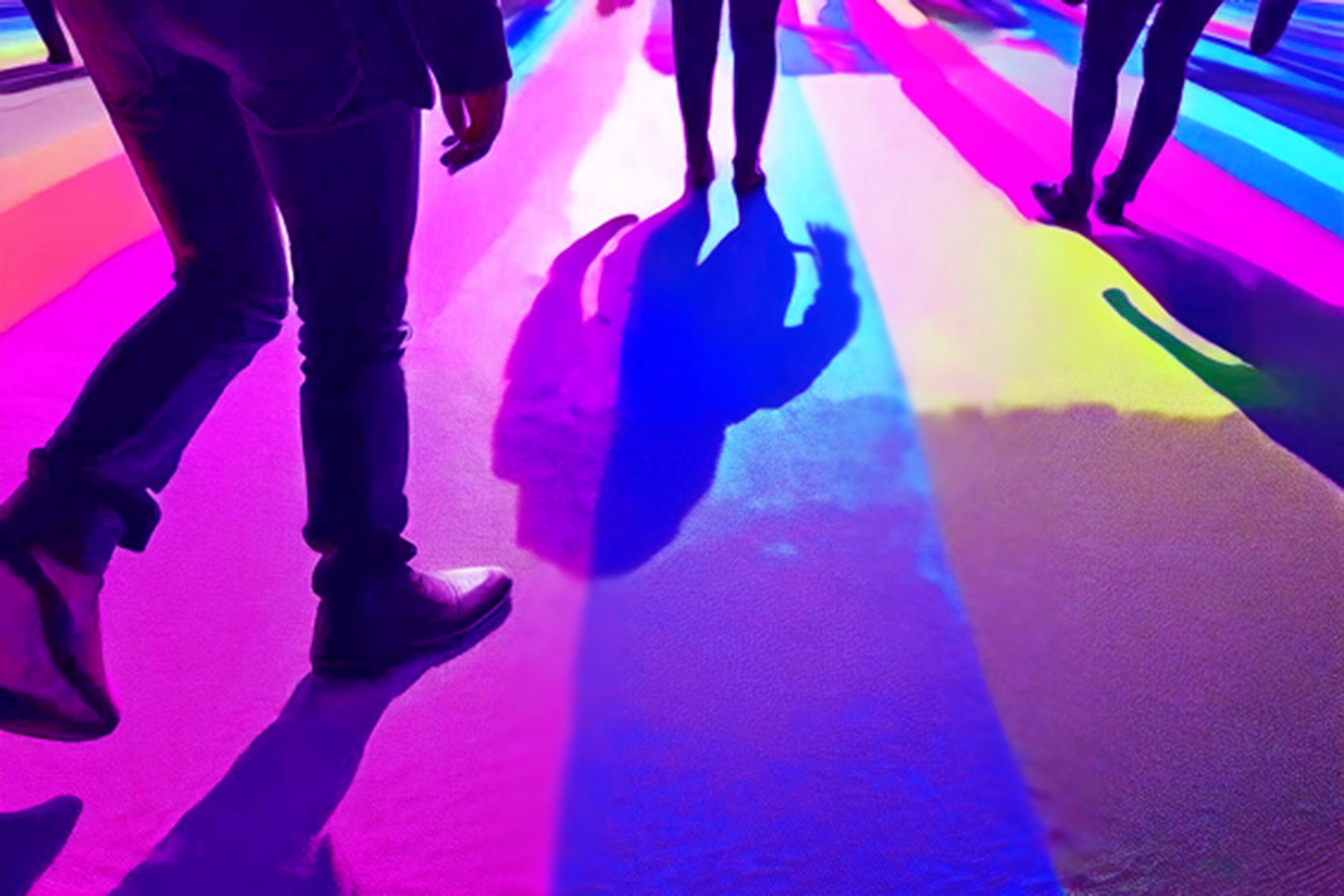空間を行き交う人の影にカラフルな色をつける光の演出を行います。