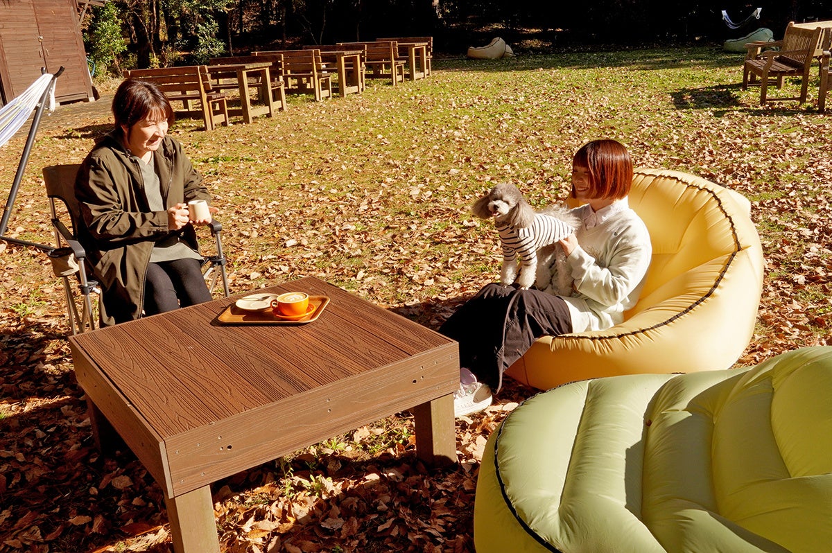 記念の森レストハウスの裏庭には、のんびりくつろげる「アウトドアシート」が期間限定で登場しました。リクライニングシートやハンモックなど、どなたでもご自由にお使いいだだけます。さらに各スペースにはドッグポールも設置されているので、愛犬と一緒にゆったりとお過ごしいただけます。