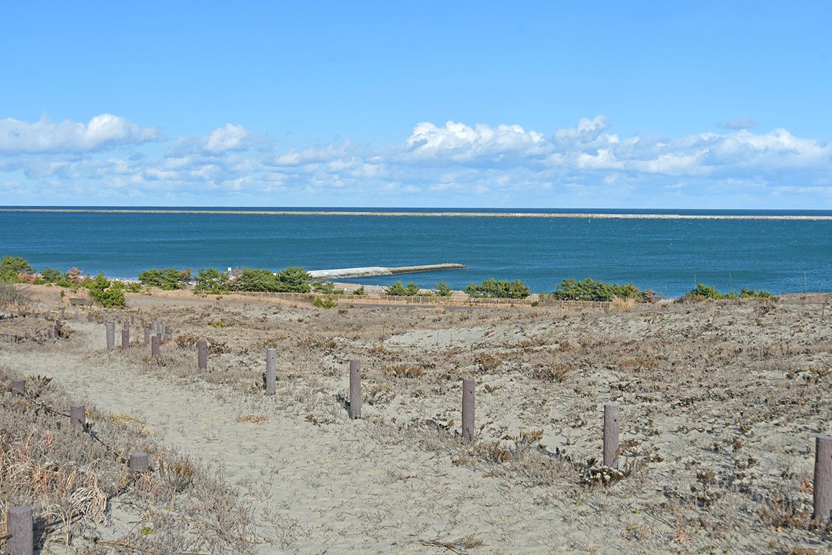 砂丘エリアは、 足もとに広がる白い砂地と、冬の深い青色の海とのコントラストが広がる絶好のお散歩コースです。静かな冬の海辺を、愛犬とのんびり散歩してみてはいかがでしょうか。