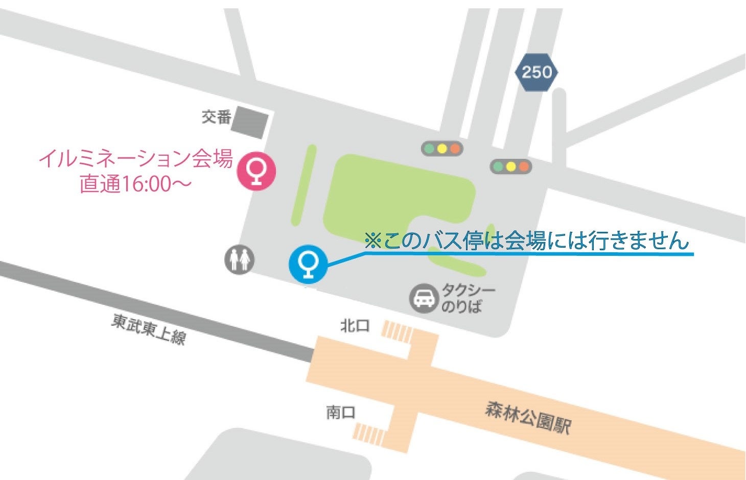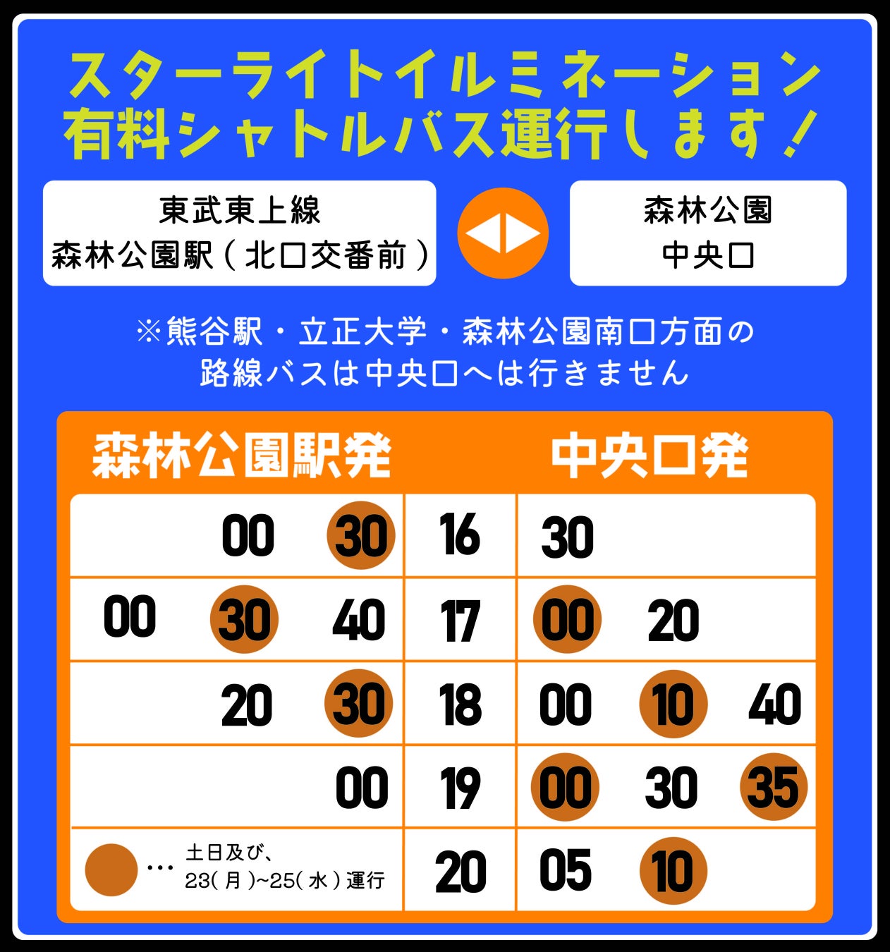 イルミネーション開催日に限り、東武東上線・森林公園駅と会場(中央口)を結ぶ、夜間シャトルバス(有料)を運行いたします。駅から会場までは約10分で到着しますので、ぜひご利用ください♪