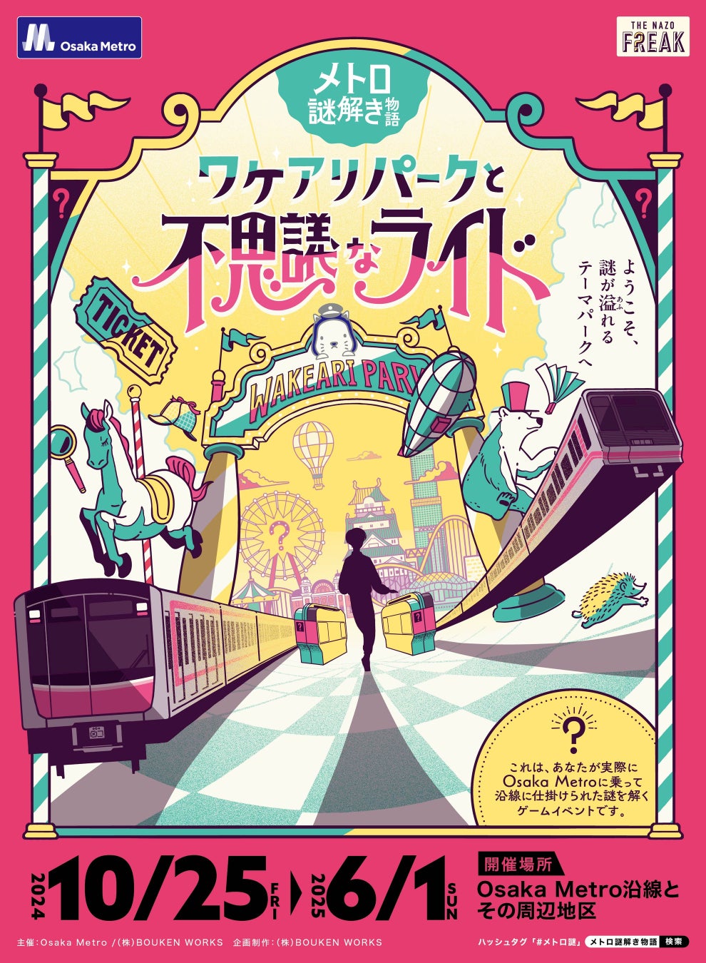 全国各地で「謎解きイベント」を企画制作する株式会社BOUKEN WORKSは、2024年10月25日(金曜日)から2025年6月1日(日曜日)まで、Osaka Metroと共同主催で、メトロ謎解き物語「ワケアリパークと不思議なライド」を開催します。