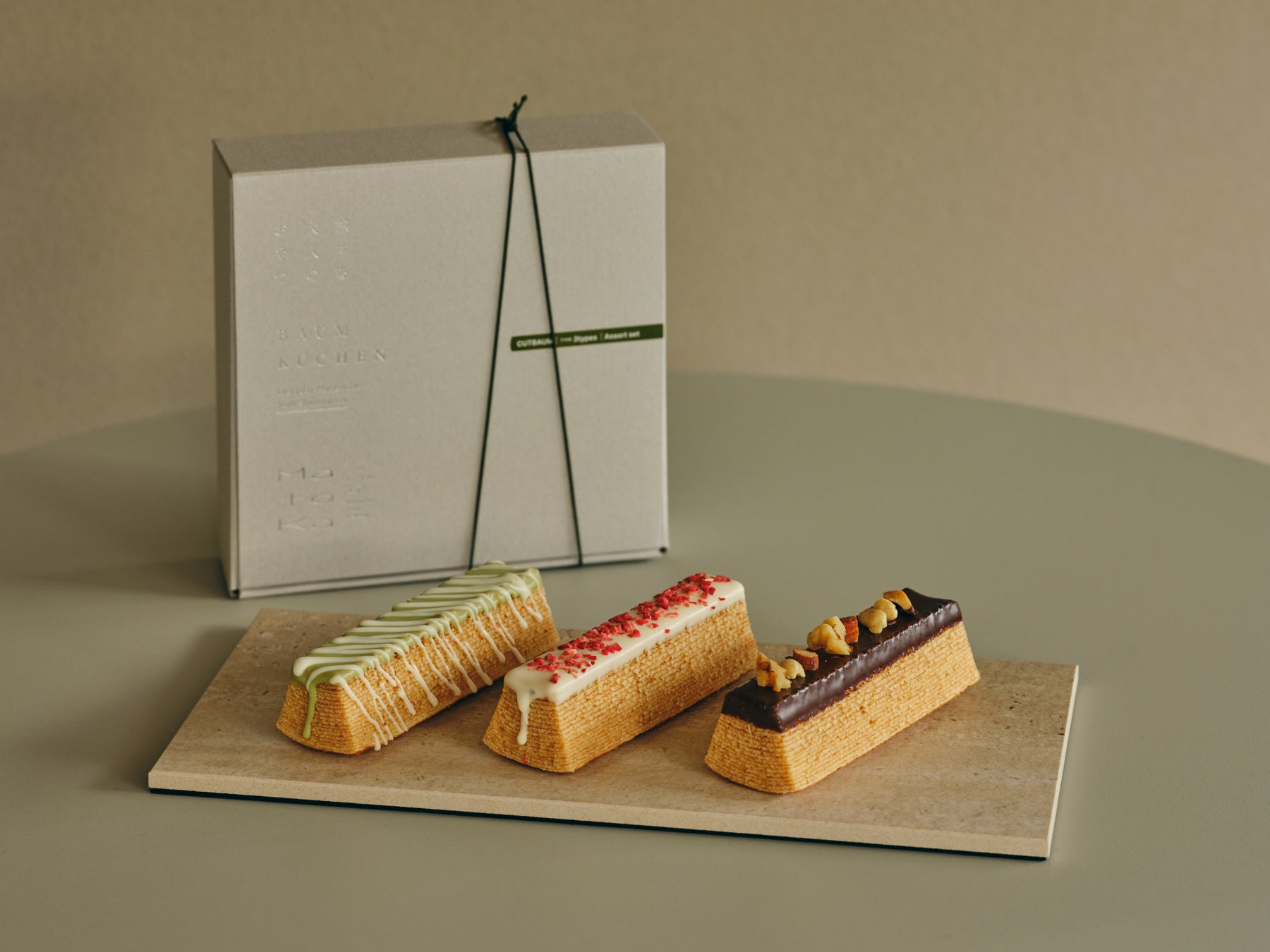 UDSでは「MatoKa」の開業に向けて、コンセプト立案からメニュー開発、ロゴやパッケージ、ウェブサイトのデザインまで一連の企画とデザインを手がけました。キーアイテムのバウムクーヘンはバスを待つ時間やほっと一息つきたいときのイートインはもちろん、テイクアウト、お土産、そして地域の方のおもたせにもご利用いただきやすいお菓子として商品開発を行いました。