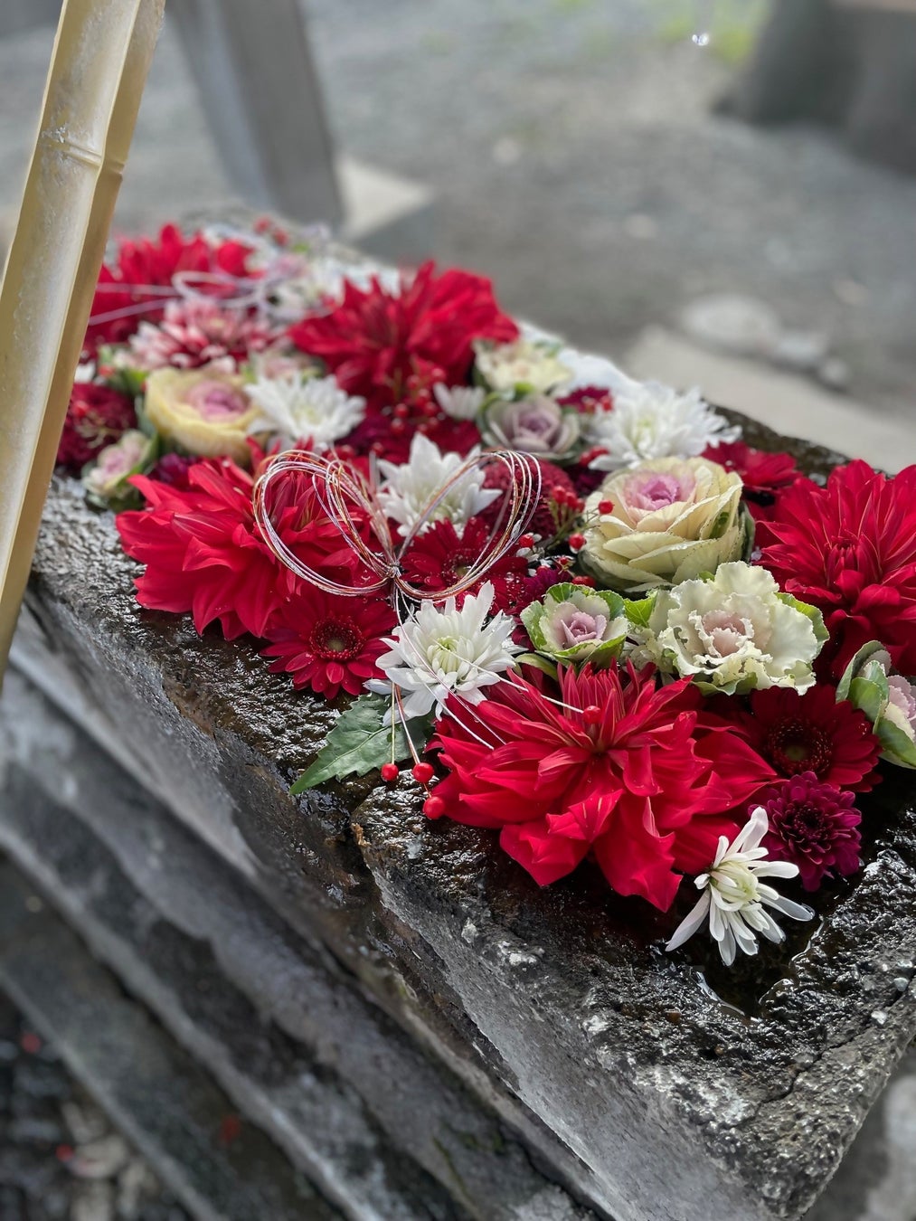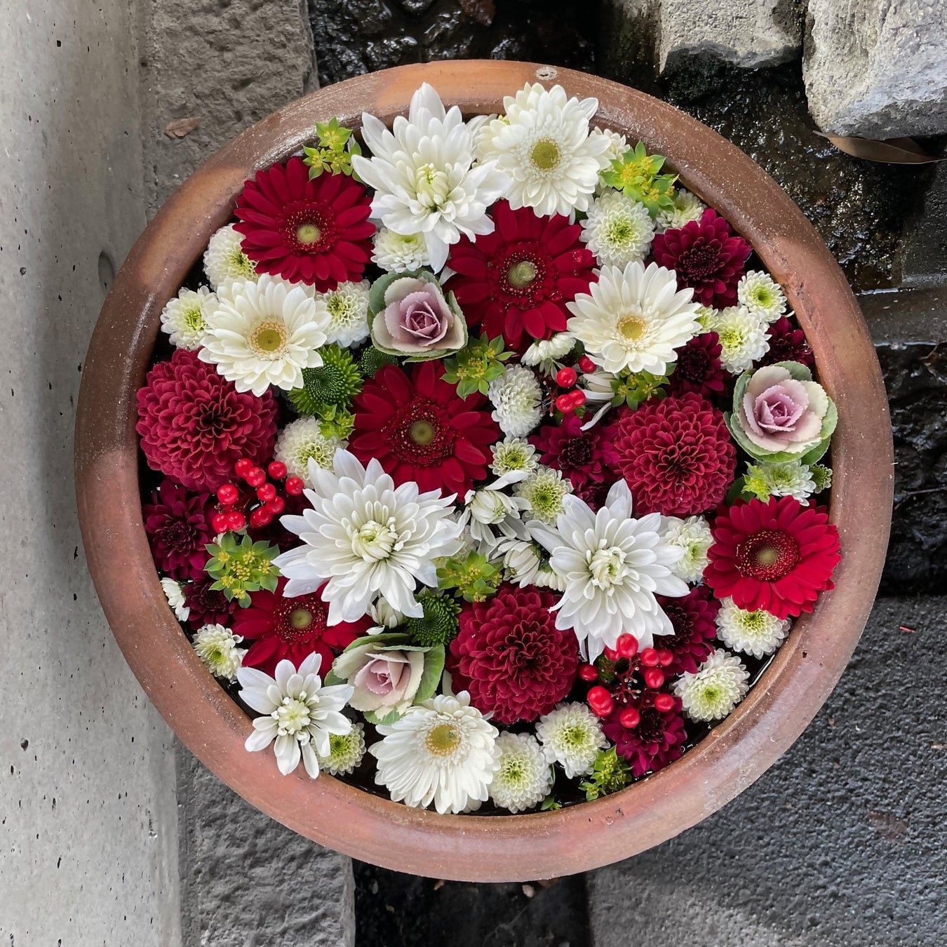 ※花手水:寺社にある手水舎(ちょうずしゃ)や、公共施設などに置いた睡蓮鉢に色とりどりの花を浮かべたもの。