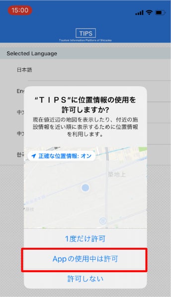 1.アプリダウンロード後に表示される「”TIPSに位置情報の使用を許可しますか?」