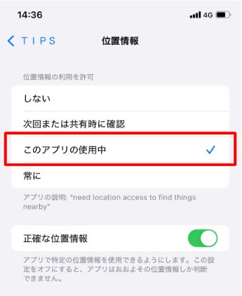 1.「設定」→「アプリ」→「TIPS」→「位置情報」→「このアプリの使用中」