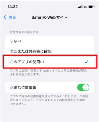 2.「設定」→「プライバシーとセキュリティ」→「位置情報サービス」→「SafariのWebサイト」→「このアプリの使用中」
