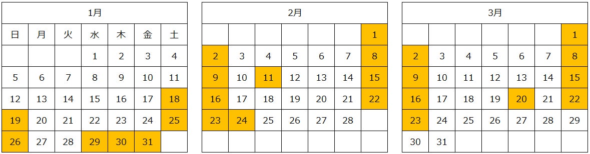 令和7年1月18日~令和7年3月23日の土・日・祝日および令和7年1/29・30・31