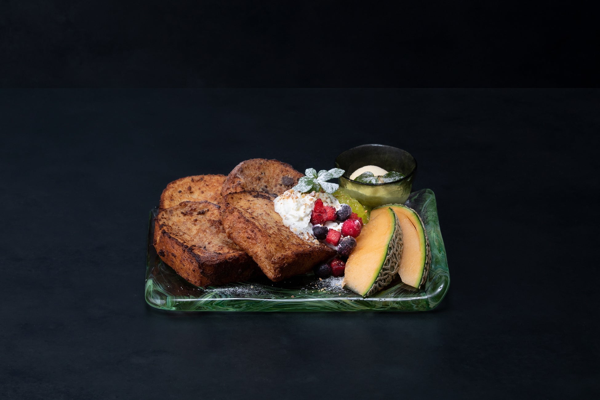たっぷりの卵とクリームを使い、外はカリカリ、中はふわふわ丁寧に焼き上げたフレンチトースト。自家製のメロンソースをかけて、フレッシュなメロンと合わせてお召し上がりください。
