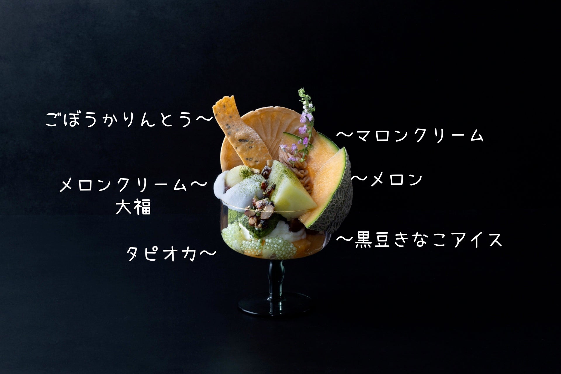 メロンクリーム大福、わらび餅、甘栗、黒豆きなこアイス、冬に食べたくなる甘味とメロンをあわせました。濃厚なマロンクリームや塩麴クリームの上にトッピングされている黒糖ピーナッツ、ごぼうかりんとうがアクセントのパフェです。冬のメロン、是非ご堪能ください。
