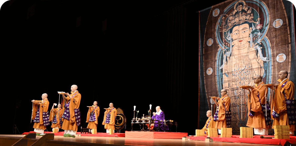 奈良県・総本山長谷寺からお招きした僧侶たちによる、荘厳な声明(しょうみょう)の特別演奏会を行います。声明とは、インドに端を発する、仏教のお経に節をつけた宗教音楽。千年の旅へと誘う歌声をお楽しみいただけます。同時に、高さ16mという日本最大の掛け軸である「大観音大画軸」のレプリカを特別展示。声明の演奏と相まって、迫力満点のステージをご堪能いただけます。