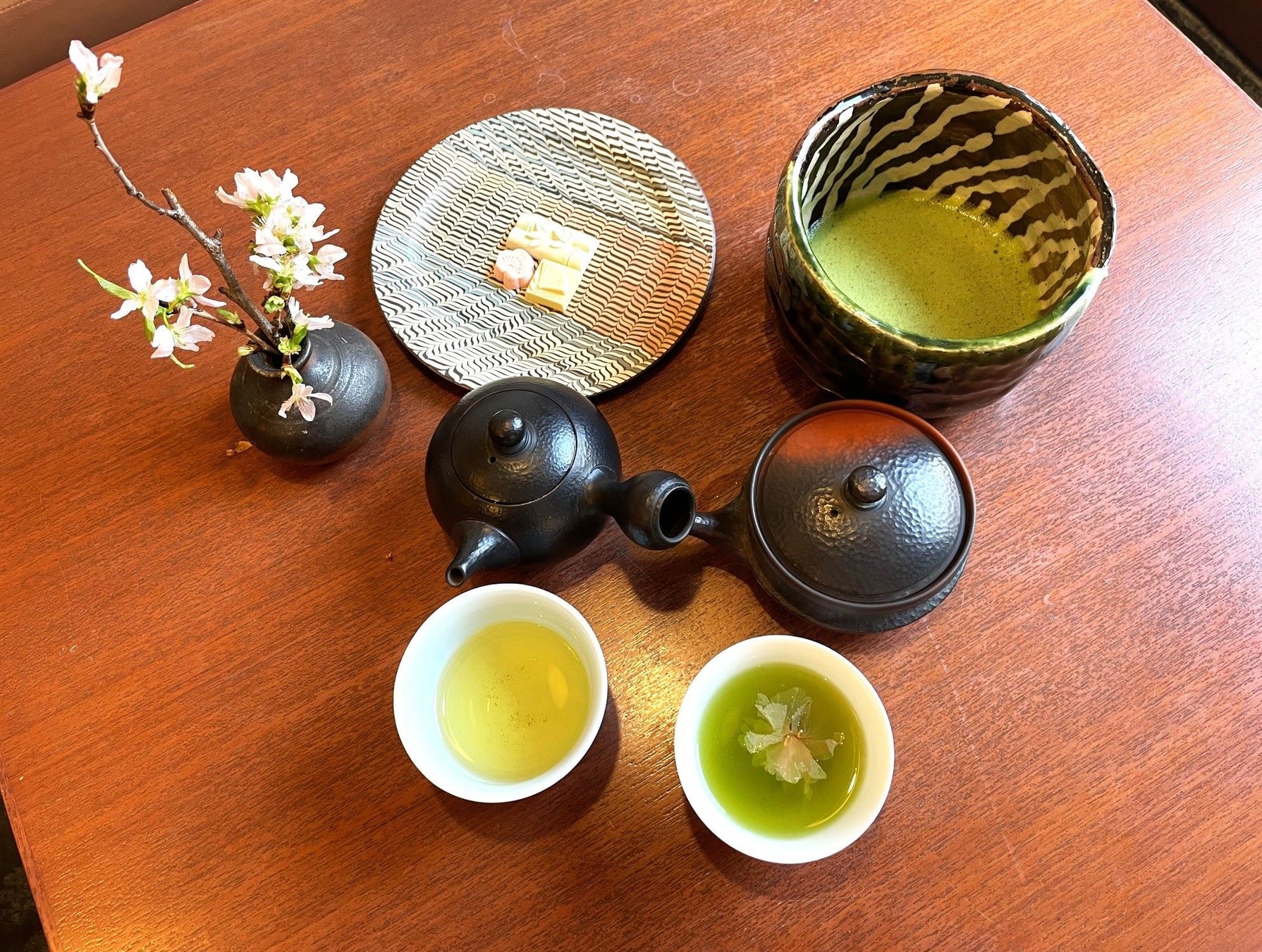 ※限定の甘い香りの煎茶など6種をご用意。菓子は桜の落雁など3種付き。