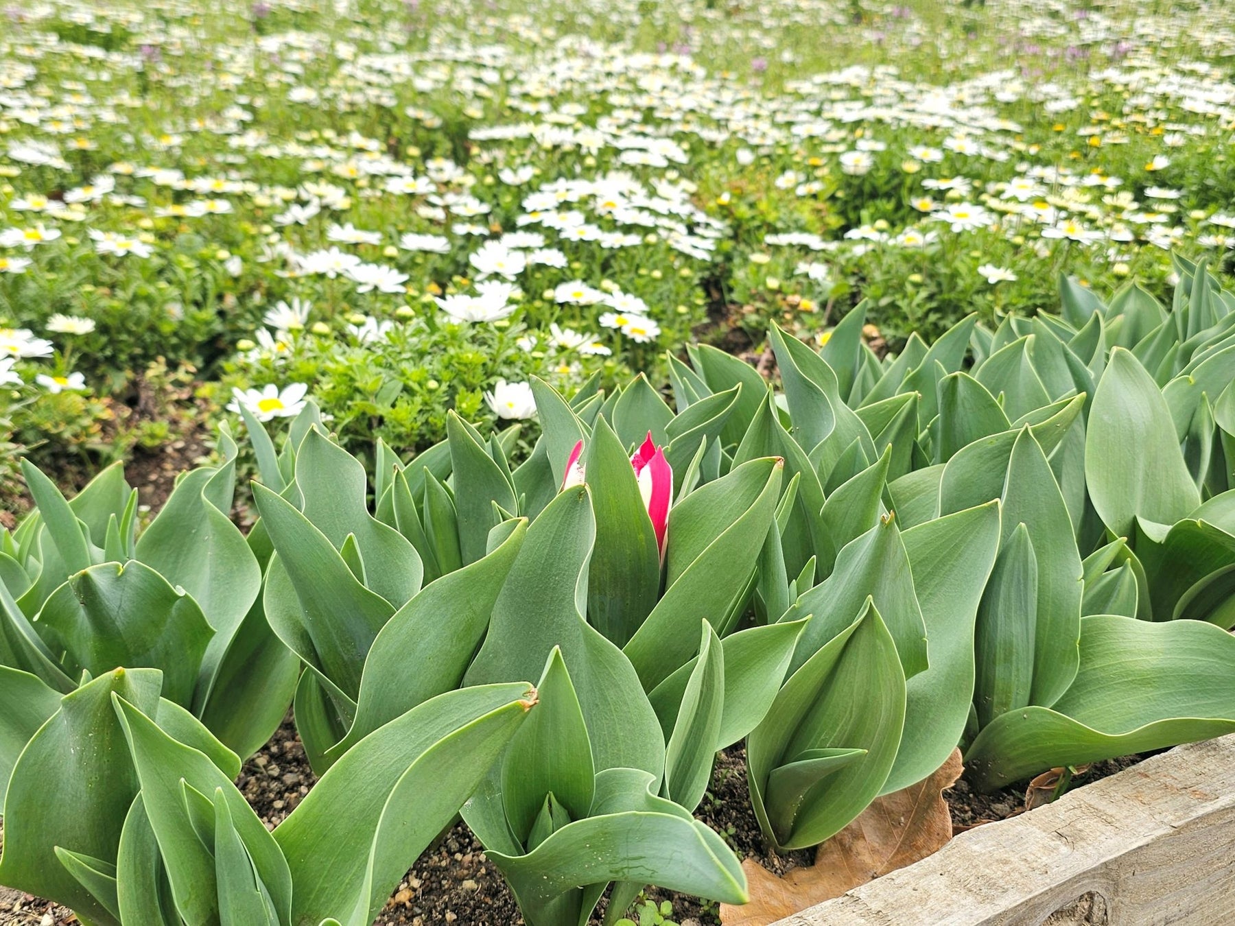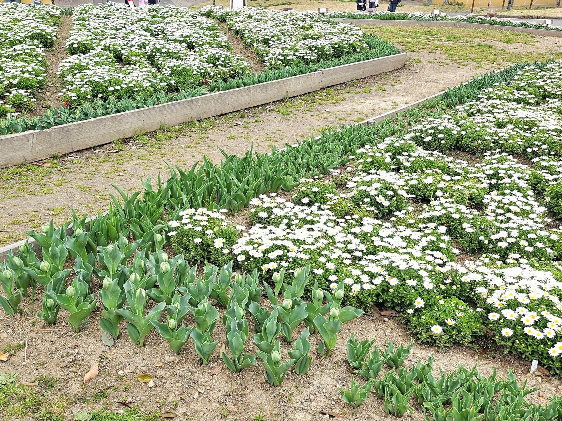 ウェルカムガーデンに咲くノースポールの周りには、48種類の変わり種チューリップを育成中。