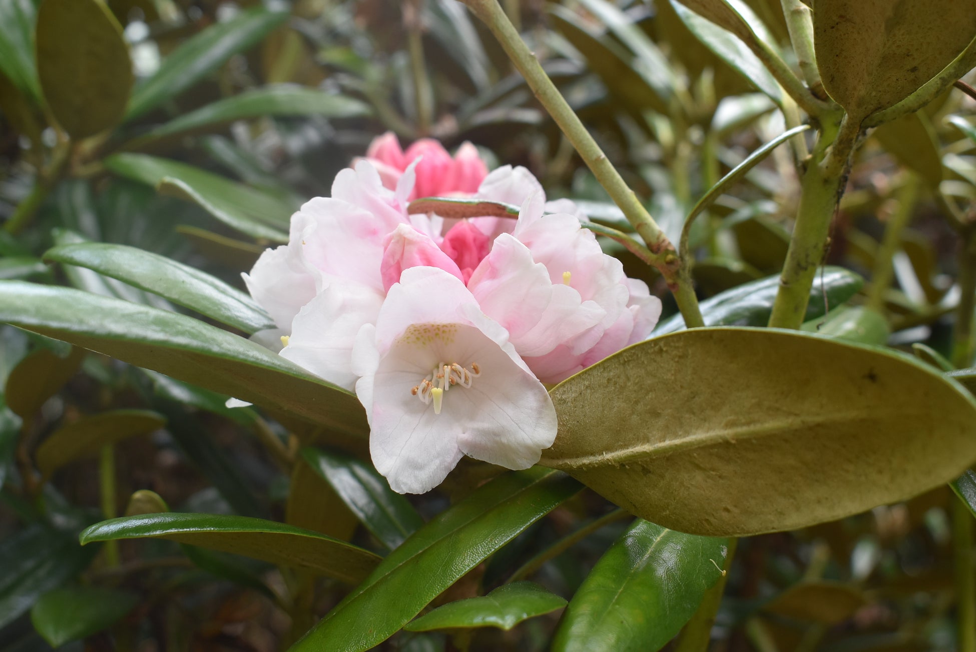 (右)「ヤクシマシャクナゲ」 日本原産の野生種。屋久島(鹿児島県)の固有種で、蕾は濃いピンクだが、開花すると白色になる。