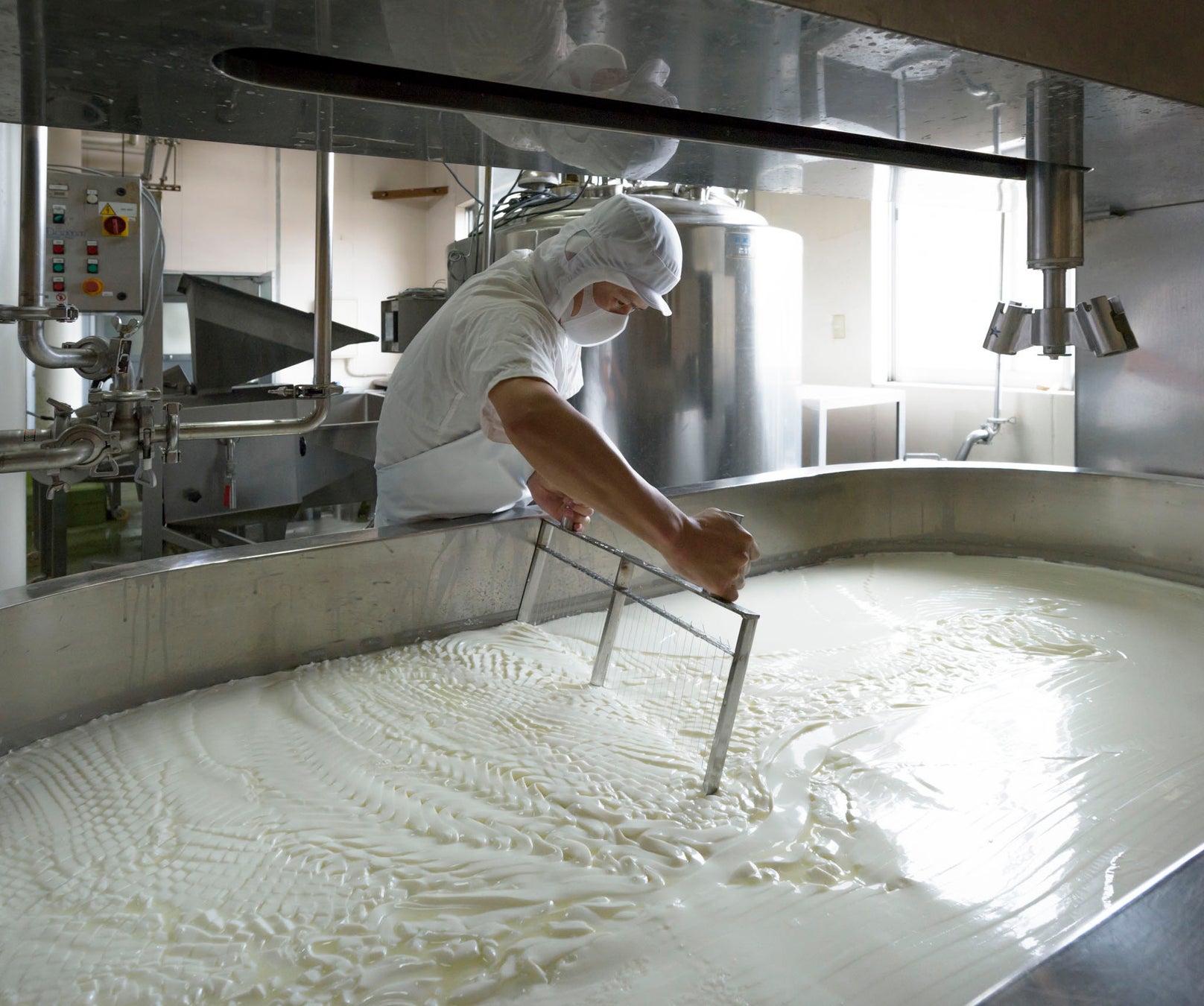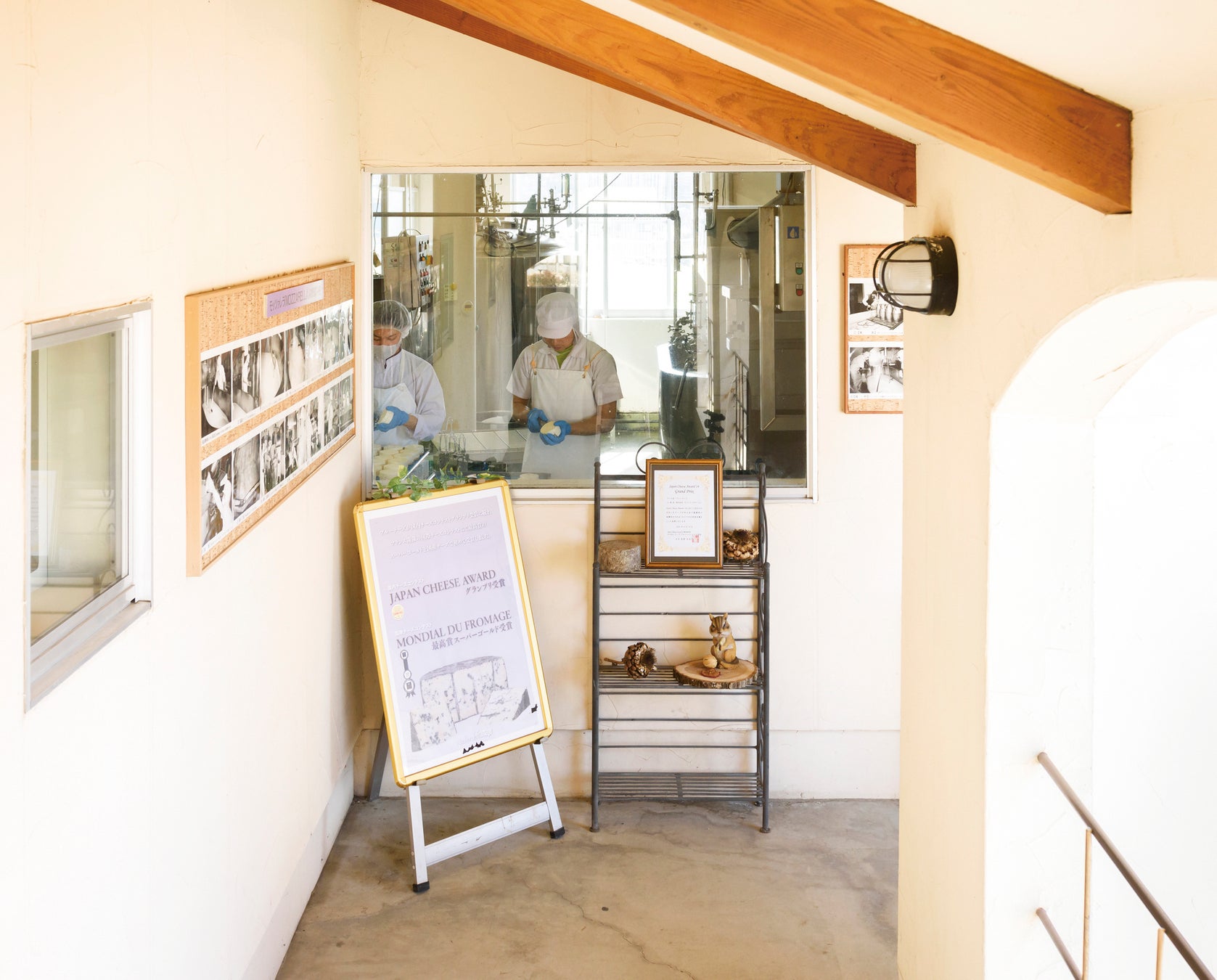 レストラン併設の工房見学通路では普段なかなか見ることのできないチーズの製造風景を自由にご覧いただけます。