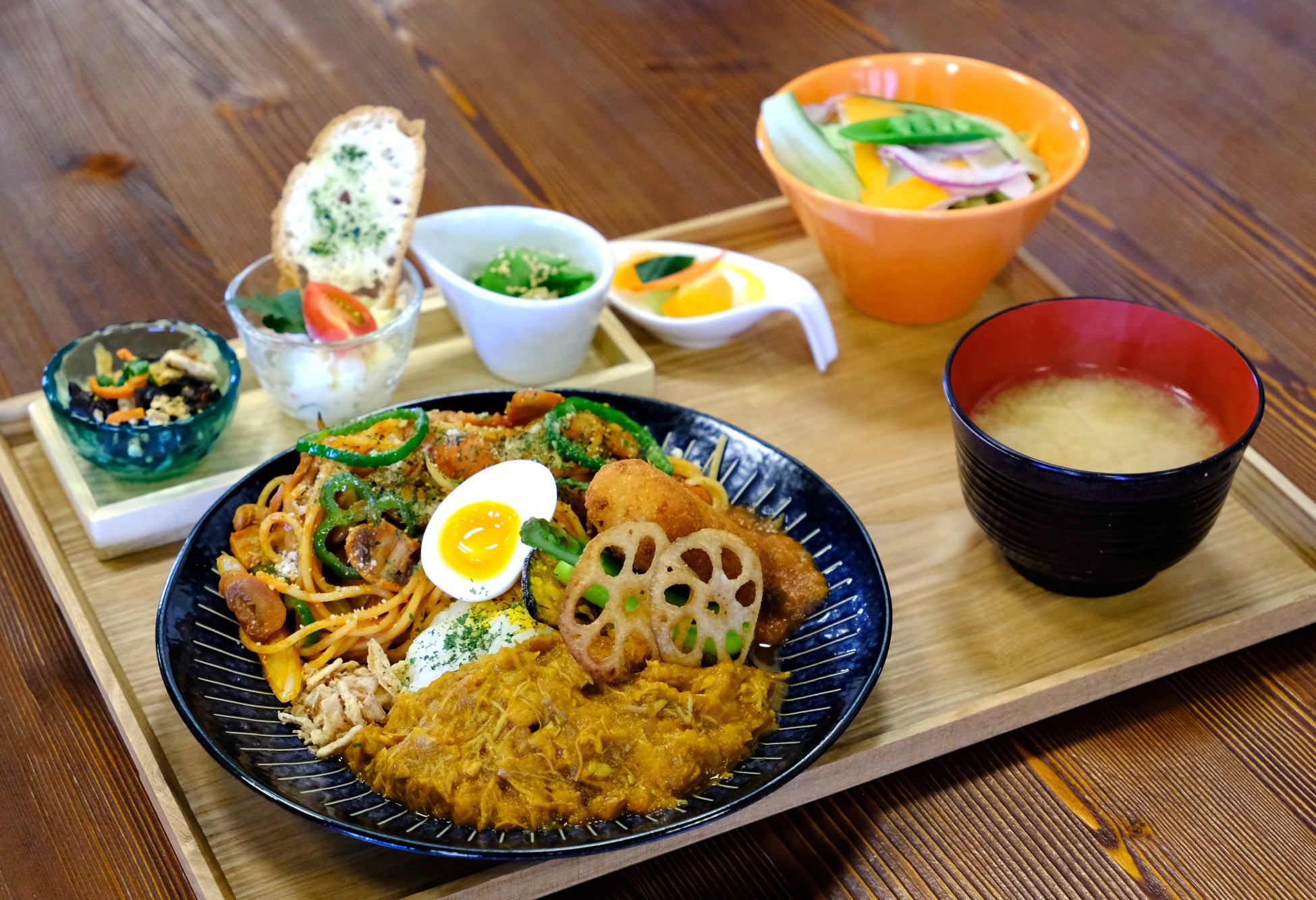 小鉢・サラダ・味噌汁どれも季節の野菜を味わえます。これからの季節は、磐梯町産のアスパラガス・春キャベツ・茎たち・サヤエンドウ・ほうれん草などを、サラダ・お浸し・グリルなどに使っていきます。パスタはその日により、ペペロンチーノ、たらこクリームなどでご用意。食後には甘さ控えめの白玉ぜんざいが付いてきます。