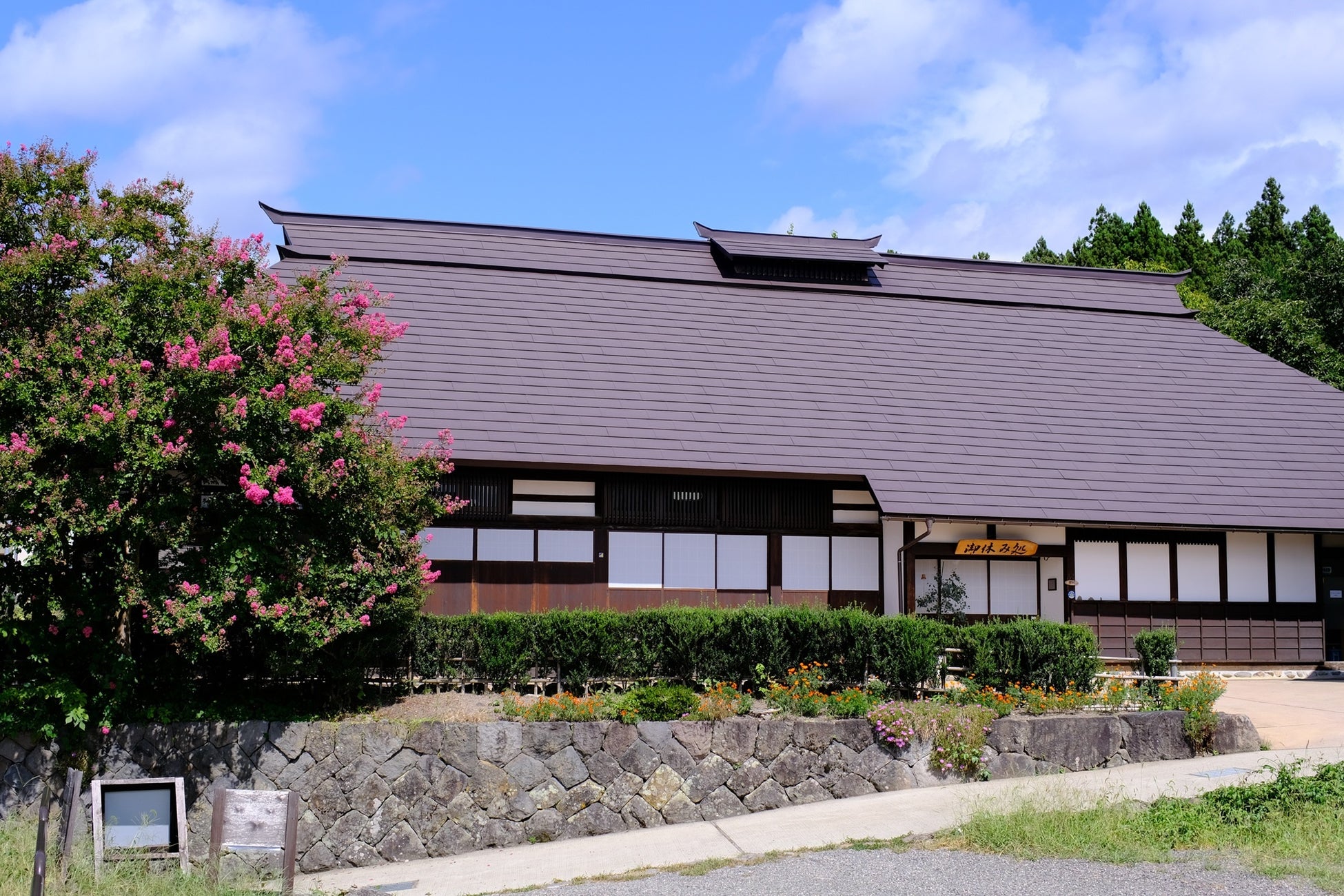 庄九郎亭外観。夏には色鮮やかなサルスベリ(百日紅)が皆様をお迎え。