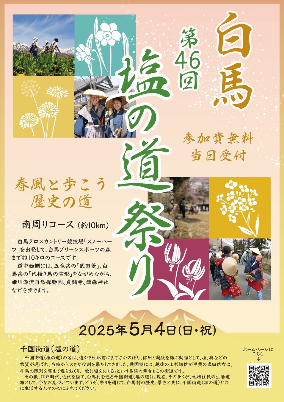 塩の道祭りは、歴史ある「千国街道(塩の道)」を練り歩くウォーキングイベントです。